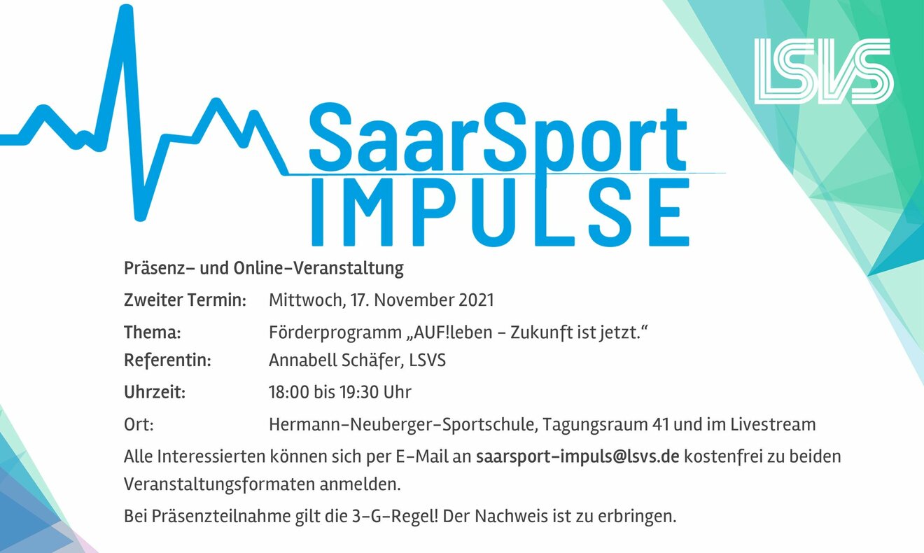 Die Veranstaltung wird am Mittwoch, 17. November 2021, von 18:00 bis 19:30 Uhr als Hybridtermin angeboten. So ist eine Teilnahme in Präsenz im Tagungsraum 41 an der Hermann-Neuberger-Sportschule in Saarbrücken oder online möglich. Die Teilnahme ist kostenfrei. Alle Interessierten können sich per E-Mail an saarsport-impuls@lsvs.de zu beiden Veranstaltungsformaten (Präsenz oder online) anmelden. Bitte bei der Anmeldung angeben, welches Format gebucht wird.