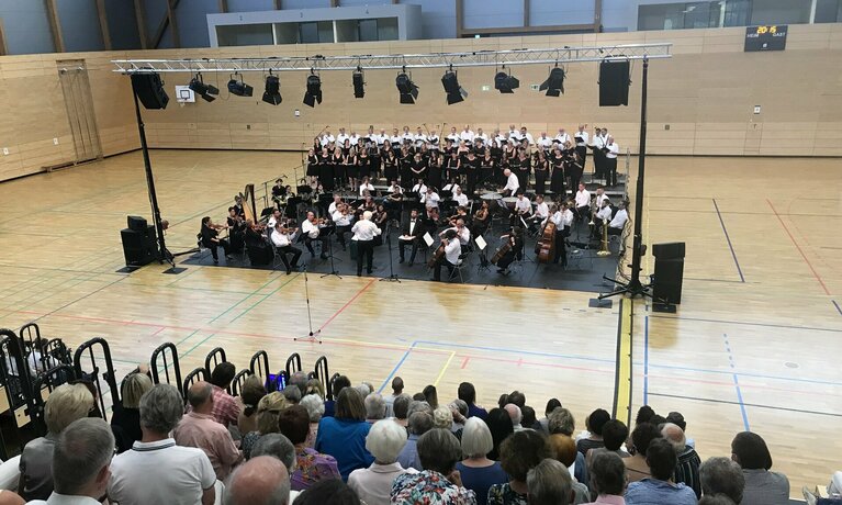 Die Multifunktionshalle wurde am 15. Juni beim Friedenskonzert als mächtiger Klangkörper ganz neu in Szene gesetzt. „Ich fühle mich hier vorne wie ein Schiedsrichter. So wie der Sport Nationen in einem Team zu vereinen vermag, schlägt auch die Musik völkerverständigende Brücken“, stellte Festivalleiter Bernhard Leonardy in seiner Begrüßung fest. Als Dirigent führte er durch das Programm mit dem Vokalensemble ’83, dem Festivalchor der Musikfestspiele Saar und der Russischen Kammerphilharmonie St. Petersburg. Für die vielen Festivalbesucher war es ein neuartiges Erlebnis, klassische Musik in einem sportlichen Umfeld zu genießen. Die großen Stimmen von Sopranistin Liudmila Lokaichuk und Bariton Christian Henneberg sowie Chor und Orchester entfalteten sich klangvoll in der großen Sporthalle.
